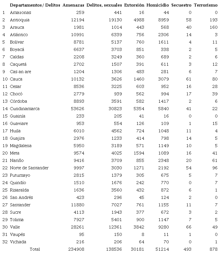 Como información primaria, se partió de las estadísticas generadas por la Policía Nacional de Colombia en su base de datos de estadísticas delictivas. Así, se utilizaron registros delictivos de amenazas, delitos sexuales, extorsión, homicidio, secuestro y terrorismo entre 2018 y septiembre de 2022. De esta forma, se consolidó la información de los diferentes delitos violentos para procesarlos, clasificados en los 32 departamentos de Colombia, como se observa en la Tabla 1.