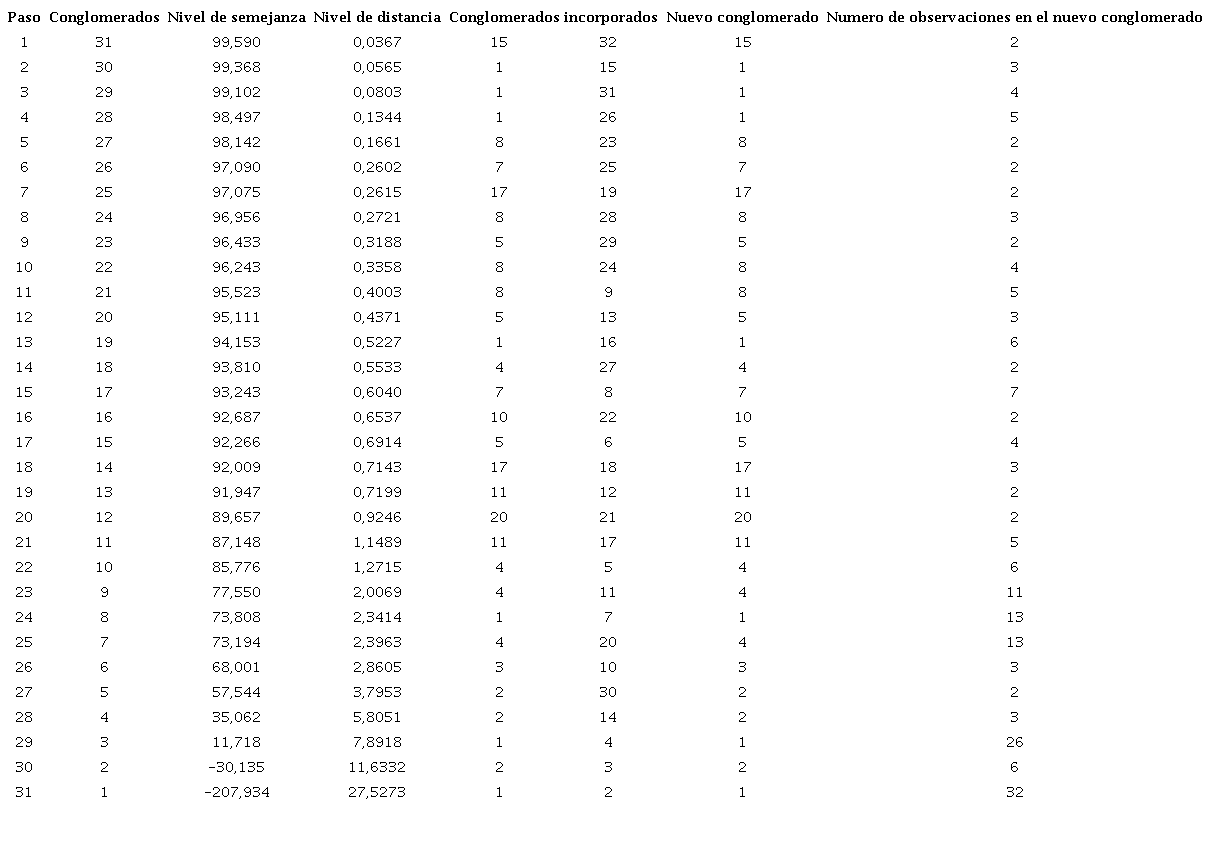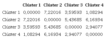 En la Figura 1, el dendograma de los cuatro clústeres de violencia por departamento en Colombia tiende a dividirse en dos grandes grupos que aglomeran la mayoría de los departamentos, y que corresponden a los clústeres 1 y 4. Sin embargo, al revisar la Tabla 5, el clúster 2 (Antioquia, Valle y Cundinamarca) muestra un conglomerado que estadísticamente resalta la mayor distancia de centroide, es decir, posee los departamentos con mayor índice de violencia en Colombia. Así mismo, al revisar el cluster 3 (Arauca, Cauca y Norte de Santander), se aprecia un centroide que presenta el segundo valor más alto de los cuatro conglomerados, de lo cual se concluye que es el segundo grupo con mayor impacto en niveles de delitos cometidos en Colombia. En consecuencia, la relación del clúster 2 con los otros tres demostró una cercanía con los departamentos del cluster 3. Ello significa que las distancias entre los grupos 4 y 1 adquieren características similares, que pueden incrementarse o reducirse en un futuro.