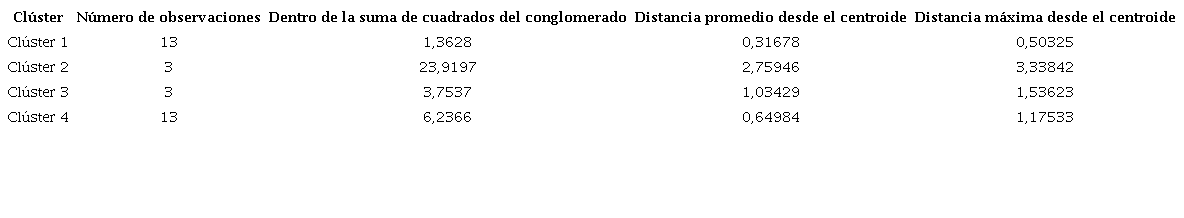 Luego, mediante el dendograma, se pudieron reconocer cuatro clústeres. El primer clúster hace referencia a los departamentos de Amazonas, Guainía, Vichada, Vaupés, San Andrés, Guaviare, Caldas, Risaralda, Caquetá, Putumayo, Sucre, Quindío y Casanare. En el segundo clúster se encuentran los departamentos de Antioquia, Valle y Cundinamarca. El tercer clúster agrupa los departamentos de Arauca, Cauca y Norte de Santander. Por último, en el cuarto clúster se encuentran los departamentos de Atlántico, Santander, Bolívar, Tolima, Córdoba, Boyacá, Cesar, Chocó, Huila, Magdalena, Guajira, Meta y Nariño. De esta manera se clasificaron los diferentes departamentos de Colombia en los grupos jerárquicos. Además, en la Tabla 3, se evalúa el número de departamentos correspondiente a cada conglomerado, sus distancias respecto al centro y su pertenencia a las características particulares encontradas en los clústeres que aluden a los criterios seleccionados para corresponder a cada grupo.