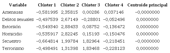 En la Tabla 3 se identifican también los clústeres según su incidencia en hechos delictivos. El clúster con mayor incidencia es el 2, seguido por el clúster 3, luego el clúster 4 y finalmente el cluster de menor incidencia es el 1, a pesar de ser uno de los grupos con mayor número de departamentos. Estos resultados muestran que el clúster 1 contiene el conjunto de departamentos con menores niveles de violencia y ocurrencia de delitos en la ventana de tiempo de evaluación de esta investigación. Por su parte, el clúster 2, aun cuando lo componen solo tres departamentos, reúne el mayor número de delitos de violencia cometidos en Colombia en el periodo evaluado. En consecuencia, en la Tabla 4 se señalan los centroides de los conglomerados asociados con los delitos de amenazas, delitos sexuales, extorsión, homicidio, secuestro y terrorismo.