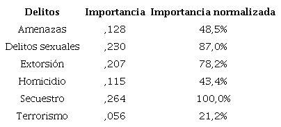 Así mismo, en la Tabla 8 se evidencia el nivel de importancia relativa de los diferentes delitos analizados ante la estructura de doble capa relacionada con la red neuronal propuesta. Se observó que el delito de mayor importancia relativa para la generación del comportamiento y los patrones es el secuestro, mientras que el de menor incidencia, relevancia e impacto dentro del modelo es el terrorismo. Esto es analizado desde la información estudiada y los resultados cuantitativos del modelo.