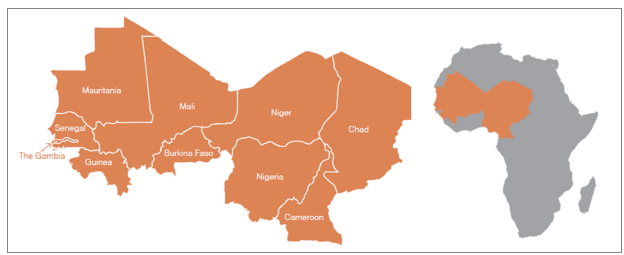 La franja del Sahel comprende 5400 km desde el Atlántico hasta el mar Rojo, cruzando África de oeste a este, siguiendo el paralelo 15, latitud norte (Figura 1). Abarca un total de 11 Estados. Sin embargo, la delimitación geográfica y política establecida por el UNISS Sahel Plan (Naciones Unidas, 2018) la limita a 10 países: Burkina Faso, Camerún, Gambia, Guinea, Malí, Mauritania, Níger, Nigeria, Senegal y Chad, excluyendo Sudán. En este sentido, el Sahel es una realidad multiforme, pues estos países tienen características propias que los diferencian entre sí, pero también comparten otras muchas (violencia, radicalización, inestabilidad política, golpes de Estado, inequidad, desertificación, inseguridad humana, crecimiento demográfico, etc.). No obstante, para este análisis se utiliza principalmente lo que se considera el Sahel institucional, que incluye los países agrupados en 2014 en el G5 Sahel: Malí, Mauritania, Burkina Faso, Níger y Chad, pues todos ellos comparten características comunes tanto históricas como sociales, culturales y económicas (Losada, 2018).