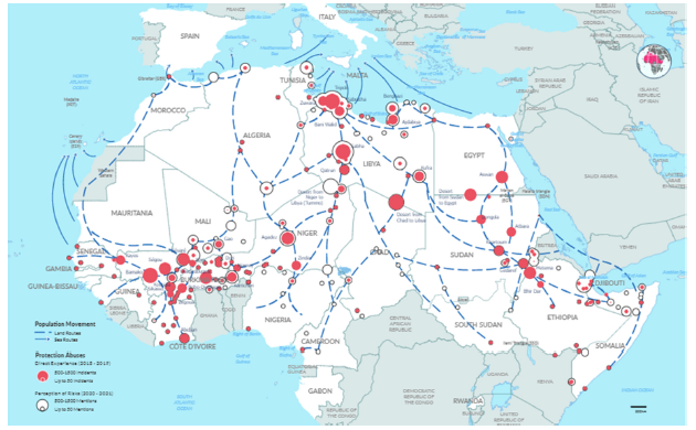 Uno de los negocios más lucrativos es el tráfico de personas y la trata, principalmente para la explotación sexual, ambos estrechamente relacionados con el incremento de las migraciones en esta región. El Sahel es un punto crucial en las rutas migratorias que se dirigen al norte, pasando por Malí, pero también hacia países productores de petróleo como Nigeria y Sudáfrica. Por estas rutas transitan tanto trabajadores locales como aquellos provenientes de Asia, así como aquellos que huyen de situaciones adversas en sus países, como violencia, desastres naturales o falta de oportunidades (Figura 2).