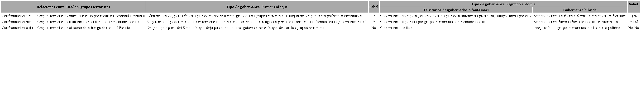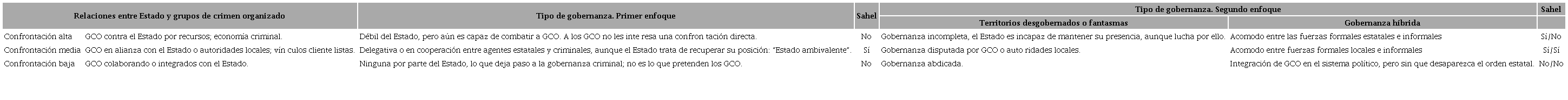 Otros autores hablan de gobernanza híbrida u órdenes políticos híbridos. Para Rodrigues et al. (2021), este concepto presupone "un acomodo entre fuerzas formales e informales, legales e ilegales, en el lugar donde funciona un mercado ilegal y una forma de control territorial y poblacional ilícito" (p. 126). Aplicando esta idea al Sahel, no cabe duda de que, junto a la autoridad del Estado, con sus normas y lógicas de poder, aunque debilitadas y cuestionadas, conviven otros órdenes tradicionales: étnicos, tribales o religiosos y, en menor medida, el orden que imponen los líderes de organizaciones delincuencia-les y criminales. Esta idea se refuerza al considerar que "la gobernanza criminal difiere de otros tipos de gobernanzas porque emerge y se desarrolla en territorios donde el Estado tiene presencia. No puede ocurrir fuera del Estado, en territorios sin gobierno" (p. 2). Las Tablas 1 y 2 presentan un resumen del modelo de análisis de los tipos de gobernanza aplicados al Sahel, en las relaciones con las autoridades estatales o locales de los GCO (Tabla 1) y de los grupos terroristas (Tabla 2).