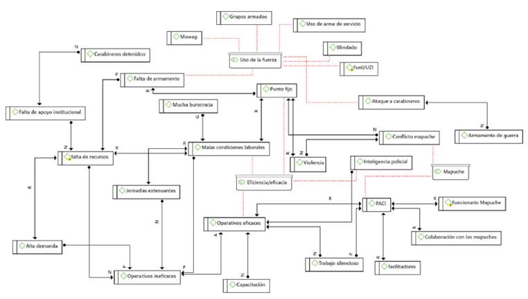 El mapa (Figura 2), elaborado con el software Atlas.ti, muestra un resumen de los red sultados de la investigación. En esta figura se usaron los códigos más relevantes y con mayor cantidad de citas para ilustrar la expresión de los 46 funcionarios policiales entrevistados. Se destaca la gran cantidad de rutas de los códigos "operativos ineficaces", "falta de recursos" y "operativos eficaces".