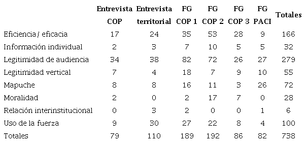 La Tabla 2 indica los grupos de códigos usados en la codificación de las entrevistas y la cantidad de citas de cada grupo según los documentos. En la misma tabla se evidencia que el grupo más citado es el de "legitimidad de audiencia", con 279 citas, seguido por el de eficiencia/eficacia con 166, el de uso de la fuerza con 100 citas y el de mapuche con 72.