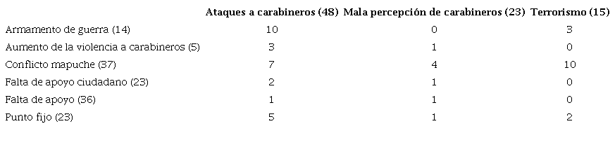 La Tabla 3 de coocurrencia muestra algunos códigos relacionados con aspectos negativos en la percepción del actuar de Carabineros. El dato más importante allí es el referido a ataques a funcionarios. El código con más citas asociadas tiene que ver con el uso de armamento de guerra en contra de la policía, el conflicto mapuche y los puntos fijos (acción policial de protección a propiedades o personas instruida por la fiscalía o la justicia). Para el código de mala percepción de Carabineros, este se ve altamente asociado con el código de conflicto mapuche, y este último, a su vez, con el código de terrorismo.