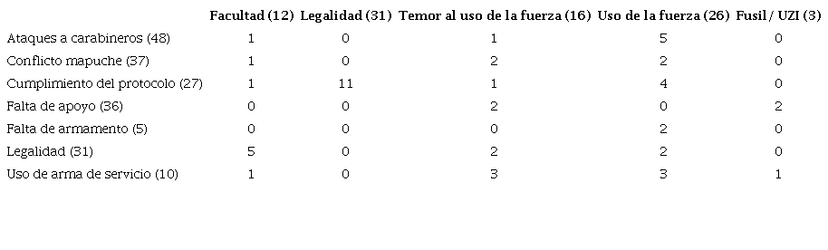 Otro aspecto importante que destacar es el uso de la fuerza de los funcionarios policiales en los procedimientos. Para ello, se presenta una nueva tabla de coocurrencia para buscar asociaciones entre los códigos (Tabla 4). Allí se puede analizar que el uso de la fuerza para los carabineros se asocia, en los mismos códigos de ataques a carabineros, con el uso del arma de servicio. Al mismo tiempo, también se destaca la asociación con el cumplimiento de protocolos y la legalidad, lo que puede ser considerado positivo debido al apego de los funcionarios a las reglas del uso de la fuerza.