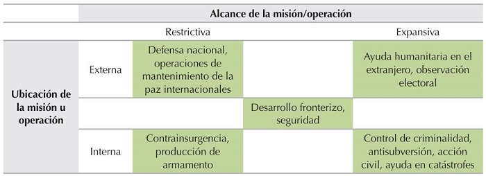 Pion-Berlin (2004), además de destacar las misiones de seguridad externa (como las operaciones de mantenimiento de la paz, la vigilancia fronteriza y la lucha contra el tráfico de armas y personas), comprobó que este marco era más amplio al verificar que las áreas de potencial intervención militar crecían hacia el ámbito interno, incluyendo misiones de seguridad pública y desarrollo (acción cívica, desastres naturales, medio ambiente, reducción de la pobreza). Las misiones de seguridad interna, especialmente en América Latina, continuaron aumentando, integrando operaciones contra el narcotráfico, seguridad pública (combate del crimen común y organizado, contrainsurgencia, contraterrorismo, orden público) y estabilidad de los espacios públicos (Pion-Berlin et al., 2012; Pion-Berlin, 2016).