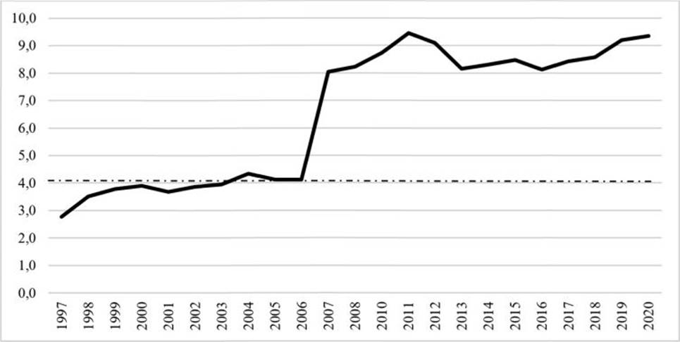 Actualmente, las FAG disponen de 18050 efectivos en activo y 63 850 miembros en la reserva. Estas cifras representan un population military balance superior a 9 (Figura 1); valores característicos de periodos de transición hacia la democracia (Pion-Berlin & Martínez, 2017).