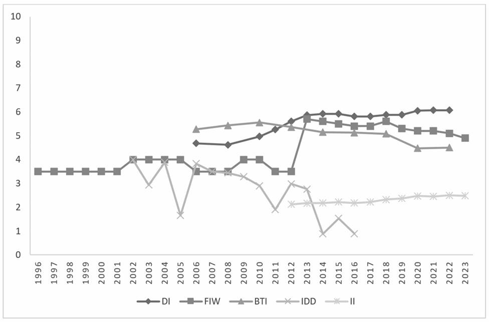 La precaria situación de la democracia en Guatemala puede ser la antesala para que la militarización de facto del sistema político plantee graves desafíos en términos de democracia, derechos humanos y gobernabilidad y, en definitiva, un militarismo de iure. La Figura 2 refleja, a través de cinco índices de medición de la democracia, la mala salud del sistema político guatemalteco en términos de ejercicio de derechos y libertades civiles, participación y cultura política, calidad institucional y rendición de cuentas.
