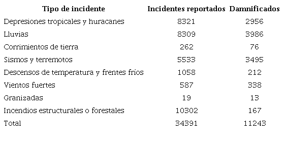 En primer lugar, la geografía del país centroamericano, localizado en la falla de Motagua, con altiplanicies montañosas -donde vive la mayor parte de sus casi diecinueve millones de habitantes-, llanuras costeras bañadas por los océanos Atlántico y Pacífico, así como la extensa selva tropical del Petén, provoca que sea una zona de alto riesgo vulcanológico, sísmico y meteorológico -con fenómenos de extremos pluviométricos como "El Niño"-, de gran impacto también en la orografía, con fuertes deslizamientos de tierra (Tabla 1). A esto se añaden las consecuencias de su clima húmedo y caluroso, que favorece el carácter endémico de diversas enfermedades tropicales -dengue, zika, chikungunya, malaria o chagas-.