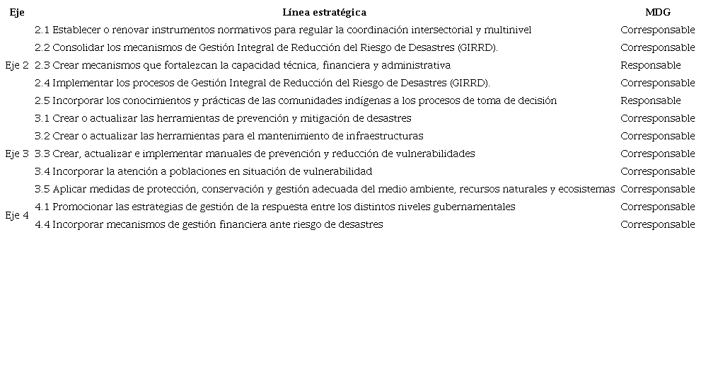 La Tabla 3 ilustra todos los lineamientos estratégicos del PNRRD y el grado de implicación del MDG. Ahí se identifica la responsabilidad asignada al MDG en la concienciación, gestión de la respuesta y prevención ante emergencias civiles y desastres. La asunción de funciones de responsabilidad conlleva el liderazgo de los procesos: en las líneas donde así se establece (2.3 y 2.5), lo hace junto con otras instituciones civiles; cuando actúa como corresponsable, supone su participación en las tareas, pero no el liderazgo.