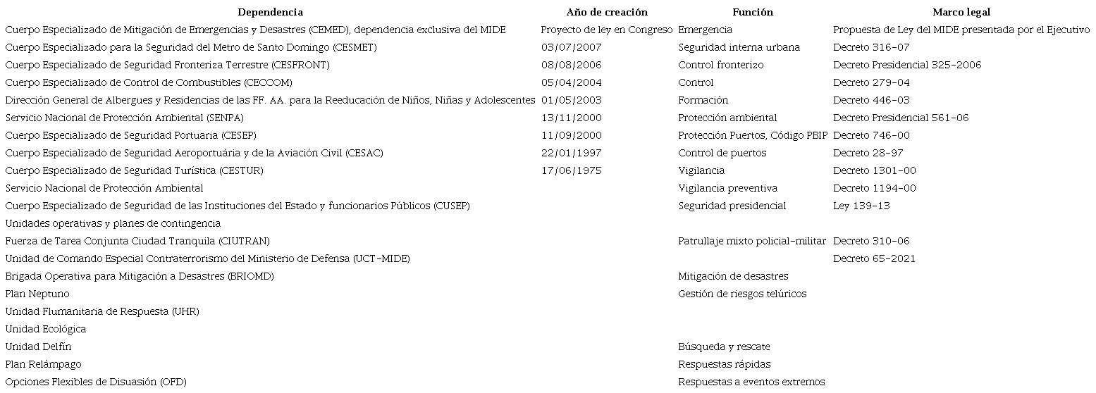 Más aún, como se observa en la Tabla 1, durante las dos últimas décadas se han creado múltiples cuerpos especializados en operaciones militares no bélicas, los cuales comprometen un porcentaje considerable de los recursos humanos y materiales del MIDE, especialmente en los ámbitos de seguridad ciudadana, seguridad portuaria, protección del sistema de transporte público urbano, protección ambiental, seguridad turística, mitigación de desastres, seguridad de instalaciones críticas, control fronterizo, migración, entre otros.