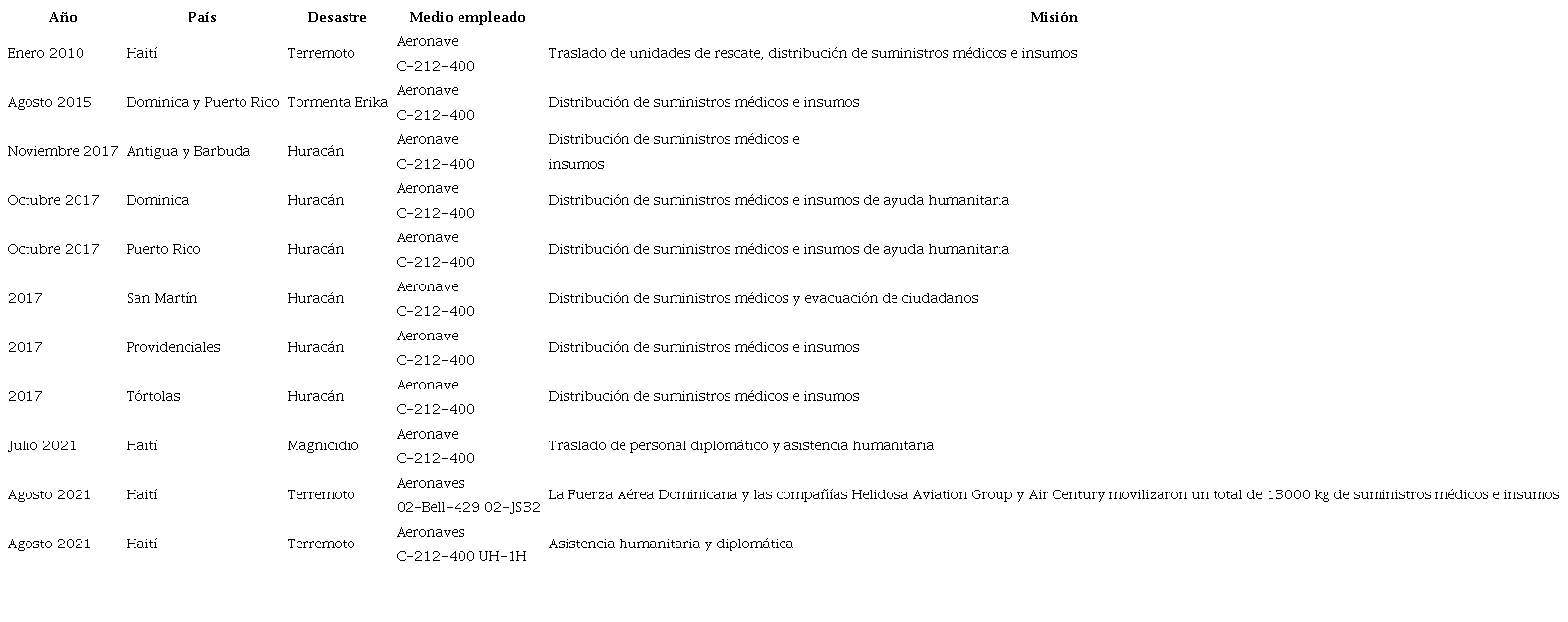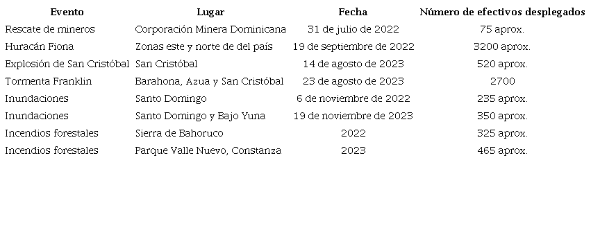La Tabla 2 muestra las diferentes misiones en las que las FAD se han involucrado en años recientes, de manera simultánea o consecutiva y en el ámbito regional y nacional. Asimismo, indica el tipo de catástrofe o crisis, como el magnicidio ocurrido en Haití en el año 2021, cuando el presidente en funciones fue asesinado por un grupo de mercenarios extranjeros, al parecer en contubernio con actores nacionales.