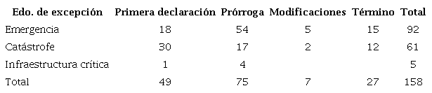 Al estudiar este proceso desde el institucionalismo histórico, debemos hacer dos constataciones. La primera es de orden numérico y la otra la evolución de los casos. Como ya señalamos, desde el final de la dictadura militar hasta ese terremoto nunca se decretó un estado de excepción, y menos uno que implicara un toque de queda. Las Fuerzas Armadas solamente habían tenido un despliegue de apoyo en operativos civiles-militares de apoyo a la comunidad, tales como operativos médicos o el trabajo de construcción de infraestructura y carreteras que realiza el Cuerpo Militar del Trabajo, amén de otros auxilios a la comunidad de un lugar determinado. Sin embargo, desde esa fecha, se han decretado estados de excepción en 158 oportunidades, aunque en estricto rigor corresponden a 49 situaciones diversas que distinguimos en la columna de primera declaración de la Tabla 1.