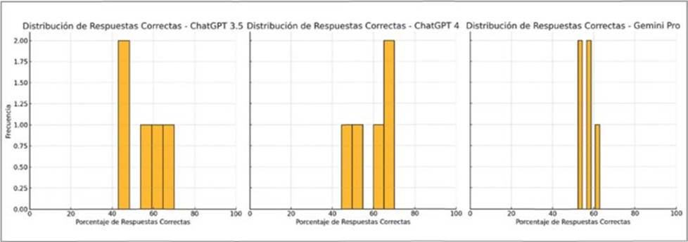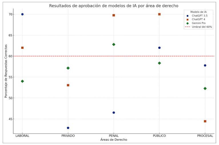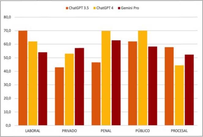 Tomando en cuenta el umbral de aprobación del 60 % de respuestas correctas, ChatGPT 3.5 logró aprobar las áreas de derecho laboral y derecho público. Por otra parte, ChatGPT 4.0 mostró un rendimiento sólido, aprobando en derecho laboral, derecho penal y derecho público. Si bien Gemini Pro obtuvo resultados similares a los otros modelos, únicamente aprobó en el área de derecho penal. Estos resultados resaltan las capacidades de ChatGPT 4.0 como el modelo más consistente de los evaluados, al aprobar la mayor cantidad de áreas, seguido por ChatGPT 3.5 y, finalmente, Gemini Pro.