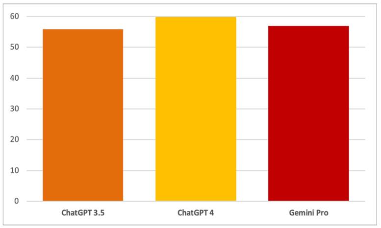 Gemini Pro, con un promedio del 56.91 %, mostró un desempeño intermedio, superando a ChatGPT 3.5, pero quedando ligeramente por detrás de ChatGPT 4. Al igual que los otros modelos, no alcanzó el umbral del 60 % en promedio, aunque estuvo cerca.
