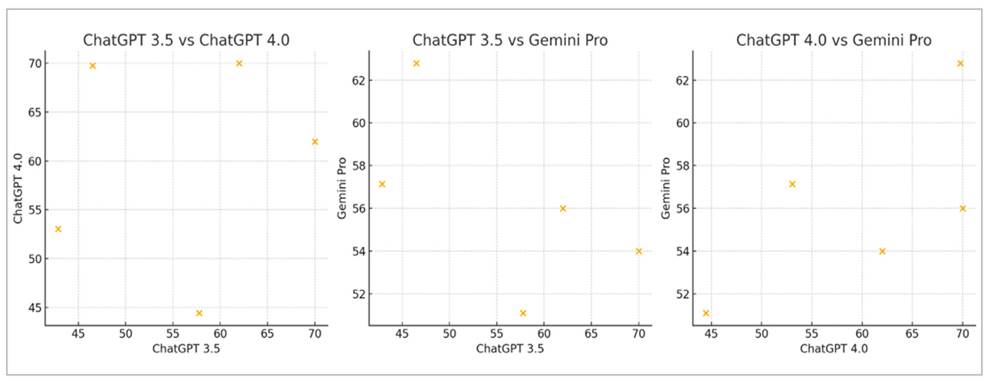 Los resultados mostraron que ChatGPT 4.0 y Gemini Pro tienen una correlación positiva moderada, con un coeficiente de 0.681. Esto sugiere que estos dos modelos tienden a tener rendimientos similares en las mismas áreas del derecho. Por otro lado, ChatGPT 3.5 mostró una correlación negativa moderada con Gemini Pro, con un coeficiente de -0.600, indicando que sus rendimientos tienden a ser opuestos en las mismas áreas. Además, la correlación entre ChatGPT 3.5 y ChatGPT 4.0 fue muy débil, con un coeficiente de 0.119, lo que indica que sus rendimientos no están fuertemente relacionados.