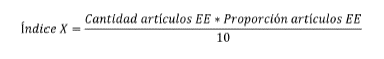 Previamente pudimos observar los resultados por cada una de las revistas (Tablas 3, 4 y 5) y globales y por conglomerado (Tabla 6). Ahora, hemos seleccionado las diez revistas de la muestra estudiada, que evidenciaron una mayor cantidad y proporción de artículos publicados cuyas temáticas guardan relación con los EE. EE. Para este efecto, se estableció un sencillo índice matemático, que relacionase la cantidad absoluta de artículos, con la proporción de estos frente al total de los artículos de la revista. Estas cifras son las mismas que se exponen en las dos últimas columnas de las Tablas 3, 4 y 5 (cantidad de artículos EE. EE.; proporción de artículos EE. EE.), y esto se divide entre diez para ajustar decimales que faciliten la presentación del índice. Este índice lo hemos denominado índice X, y puede expresarse matemáticamente así: