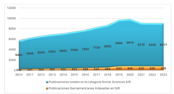 Para determinar la muestra se acudió al Scimago Journal & Country Rank (SJR), entendiendo que este ranking e indicador bibliométrico desarrollado con la base de datos de Scopus permite catalogar la data bibliométrica de revistas según regiones, países y categorías temáticas. En este sentido, el universo de revistas indexadas en el área de ciencias sociales en SJR de 2023 es de 8217, de las cuales 828 (10,07 % del universo) son publicaciones iberoamericanas.