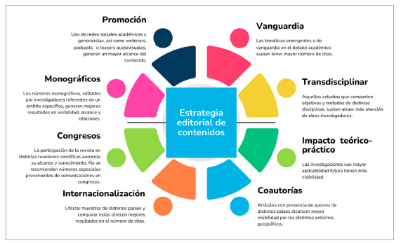 La publicación digital y el acceso abierto han ayudado enormemente a la visibilidad y el acceso a una audiencia más amplia de las publicaciones latinoamericanas (Estrada-Mejía & Forero-Pineda, 2010). Sin embargo, el paso hacia el ecosistema digital ha convertido el papel del equipo editorial, otrora dedicado casi en exclusiva a la gestión de manuscritos y revisiones, en equipos multidisciplinares (Dinu & Baiget, 2019), que deben conocer, y aplicar, estrategias de optimización para motores de búsqueda y bases de datos -SEO Académico-, sumado a lógicas de marketing online en redes sociales (Ivanov, 2011; Sarlis et al., 2017), e-mail marketing e incluso de relaciones públicas en congresos y asociaciones internacionales de investigadores, en la búsqueda de implementar tácticas para maximizar la atención sobre sus contenidos (Erskine & Hendricks, 2020).