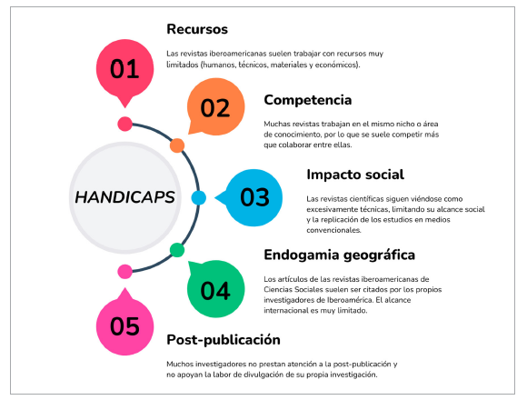 A la luz de las opiniones manifestadas por los profesores entrevistados, se pueden establecer cinco hándicaps en relación con la divulgación de artículos científicos. El primero de ellos es la escasez de recursos. En este sentido, coinciden Igor Esnaola, de la Revista de Psicodidáctica; Javier Marzal, de adComunica, y Almudena Barrientos-Báez, de la Revista Latina de Comunicación Social, quienes manifiestan no contar con personal suficiente: "Apenas tenemos ayuda y recursos para poder hacer más de lo que ya hacemos". Un segundo hándicap es la competencia en las redes sociales. Varios de los profesores han señalado que el panorama competitivo de las redes sociales es un desafío, ya que las editoriales más grandes dominan la esfera comunicativa, de modo que se requieren grandes esfuerzos adicionales para destacar en el panorama global.