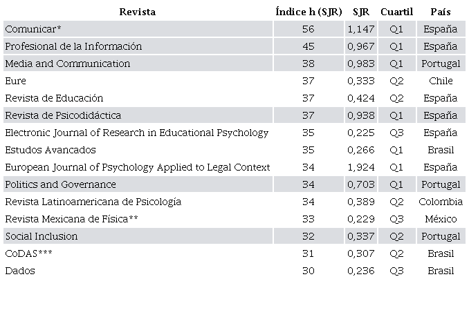 Teniendo en consideración que el cuartil (Q) asignado a cada publicación depende de la categoría en la que se inserta -solo dentro de ciencias sociales existen 44 categorías-, la selección muestral se realizó por el índice de Hirsch (h). La elección de este índice se justifica al entender que son las revistas con mayor número de citas en el mayor número de documentos citables, lo que se consigue con una buena estrategia de divulgación y visibilidad de los artículos. Las revistas con mayor índice h reportado en el SJR 2023 son las que se presentan en la Tabla 1.