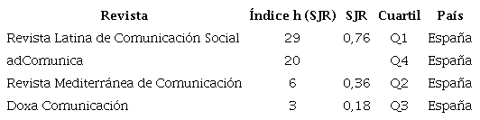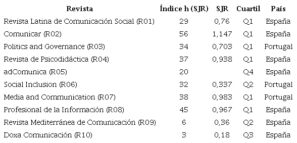 Así, la muestra definitiva del estudio queda compuesta por diez publicaciones, seis escogidas por el índice H, y cuatro emergentes intencionales (Tabla 3).