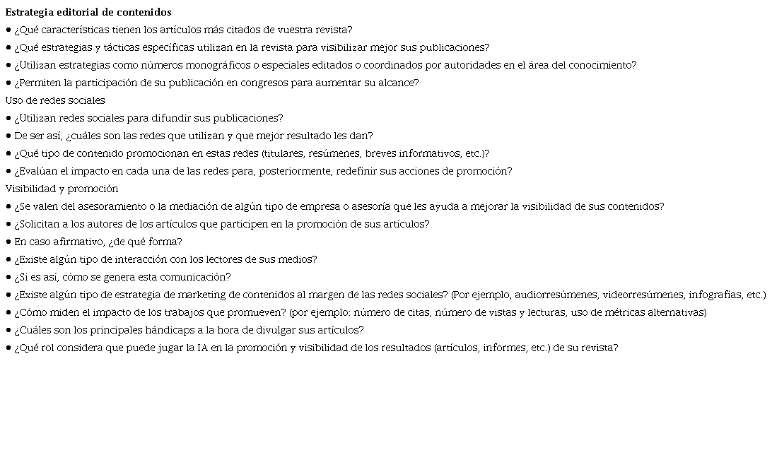 Se estructuraron tres bloques de preguntas en función de los objetivos de esta investigación. El primer grupo corresponde a las estrategias editoriales de contenido; el segundo está relacionado con redes sociales, y el tercero, con el tema de promoción y visibilidad, excluidas las redes sociales.