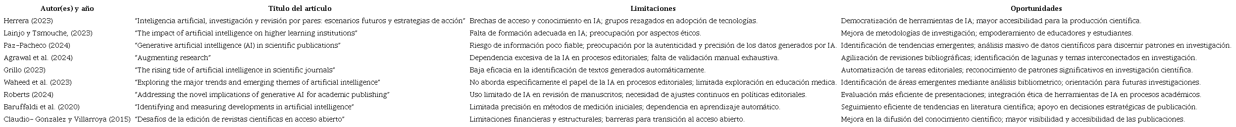 La IA ofrece una solución pertinente para enfrentar estos desafíos, optimizando los procesos de edición, asegurando la cohesión temática y permitiendo la identificación de tendencias emergentes de manera precisa. Sin embargo, también es necesario abordar las implicaciones éticas de su uso, tales como el sesgo algorítmico, la homogeneización del conocimiento, la privacidad y propiedad intelectual y la transparencia en la toma de decisiones. La revisión de los artículos al respecto (Tabla 1) destaca un equilibrio entre las limitaciones y las oportunidades que ofrece la IA en los procesos editoriales.