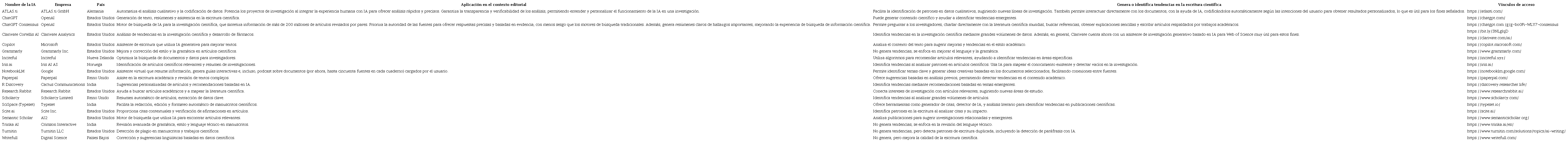 La Tabla 3 especifica una serie de herramientas impulsadas por IA que apoyan los procesos editoriales. Adicionalmente, se señala si estas generan o identifican tendencias editoriales en la literatura científica.