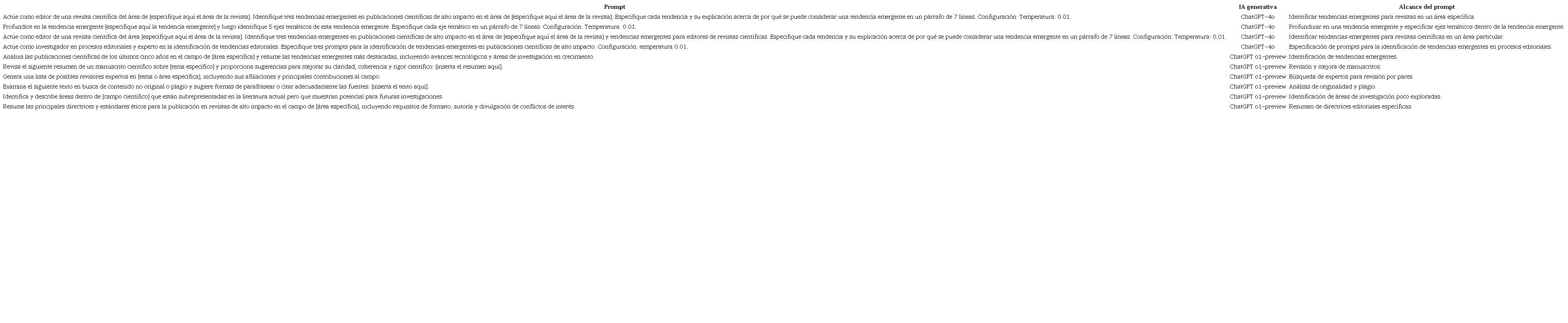 También es esencial tener presente que la IA generativa permite especificar prompts que contribuyen a optimizar el proceso editorial y a identificar tendencias emergentes en áreas específicas de publicación. A la luz de esto, la Tabla 3 muestra algunos prompts que tienen dicho potencial.