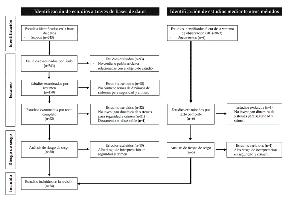 Con la ecuación de búsqueda en la base de datos Scopus y una ventana de observación de diez años (2023-2014), se identificó un total de 243 documentos. Después se procedió a realizar un filtro con las palabras clave y áreas temáticas indicadas en la sección respectiva. En el proceso de escaneo de los textos completos se identificaron y se incluyeron otros seis documentos por revisión de literatura secundaria, los cuales son de años diferentes a la ventana de observación. Luego, fueron excluidos 213 documentos de acuerdo con la revisión por título (93 documentos), por resumen (98) y por revisión del texto completo (22). Finalmente, se realizó una revisión de los treinta artículos preseleccionados por medio de la ecuación y cinco por otro método, excluyendo otros once artículos por no abordar las preguntas orientadoras desde un enfoque de población, concepto y contexto (Tricco et al., 2018) en DS aplicados por cuerpos de policía, militares y organismos de seguridad en el mundo en temas de seguridad y crimen (Figura 1).