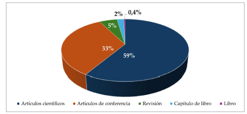 La Figura 2 ilustra los tipos de documentos examinados que van desde artículos científicos hasta la publicación de otras contribuciones académicas. Dicha figura muestra un predominio de artículos científicos, lo que subraya la naturaleza dinámica de la investigación en este campo. Los artículos de conferencias con un 33 % reflejan tendencias y avances recientes, mientras que las revisiones, capítulos y el libro ofrecen síntesis exhaustivas de los conocimientos actuales. Finalmente, los capítulos de libros contribuyen sustancialmente al ofrecer un marco conceptual importante.