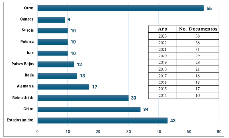 El mapeo geográfico y temporal de la literatura revela la difusión global y evolución temporal de los resultados de la investigación. El top 5 de los países con contribuciones importantes son Estados Unidos, China, Reino Unido, Alemania e Italia con un 56 % del total de los documentos encontrados, y la participación de las publicaciones en los últimos cinco años con un 67 %, lo que subraya la aplicación práctica en los contextos más relevantes y actuales para el enfoque del estudio (Figura 3).