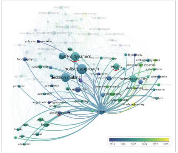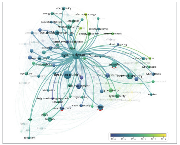 Asimismo, la Figura 5 evidencia un nodo central, el cual indica una fuerte atención académica a los mecanismos y estrategias que sustentan el uso de la DS por cuerpos de policía, militares y órganos de seguridad en el mundo. La red también aclara la estrecha relación entre crimen con seguridad, aplicación de la ley y dinámica de sistemas, profundizando el uso de pensamiento sistémico y su impacto en sistemas de seguridad con literatura de los últimos cinco años.