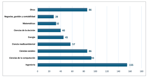 Por otro lado, en cuanto al top de las áreas temáticas que concentran el 65 % de los estudios son ingeniería (25 %), ciencias de la computación (15 %), ciencias sociales (14 %), ciencias de la decisión (6 %) y negocios, gestión y contabilidad (5 %) (Figura 6). Lo que permite priorizar los estudios de acuerdo con la aplicabilidad e impacto de la DS. Las otras áreas ayudan a dar una idea y soportar la evidencia científica de acuerdo con algunos clúster conformados en las Figuras 4 y 5.