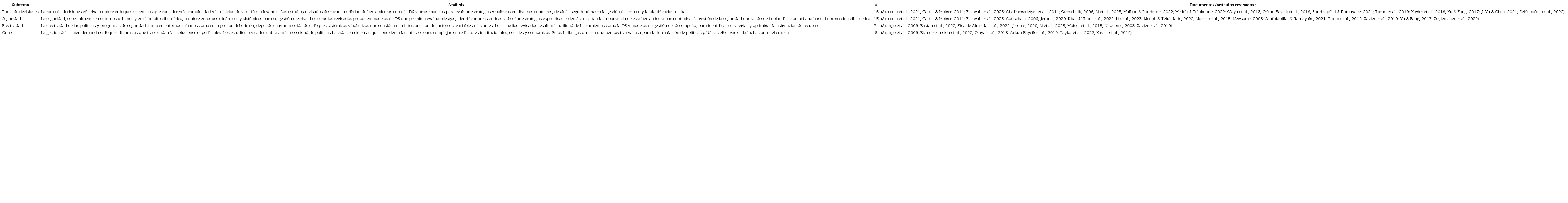 Luego de examinar las áreas temáticas y evaluar los textos completos para determinar la elegibilidad, se incluyó un total de 24 documentos declarados en la Figura 1; veinte son artículos académicos y cuatro de revisión. El análisis cualitativo de los datos extraídos da cuenta de la distribución de subtemas clave para la revisión y que van inmersos en la áreas descritas en la Figura 6, los cuales emplean DS para el entendimiento de sistemas complejos que explican un problema. Estos subtemas evidencian el enfoque holístico como una solución para temas de seguridad y crimen, los cuales se sintetizan en la Tabla 1.