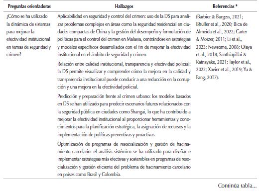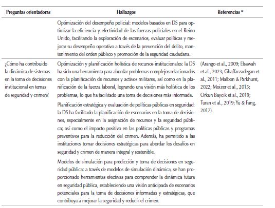 La revisión exhaustiva de la literatura revela un panorama prometedor en el uso de la DS como herramienta clave para abordar la complejidad inherente a los desafíos en el campo de la seguridad y el crimen. Con los diversos estudios examinados se evidencia que la aplicación de enfoques sistémicos no solo ha permitido comprender mejor la naturaleza multifacética de estos problemas, sino que también ha impulsado mejoras significativas en la toma de decisiones estratégicas.