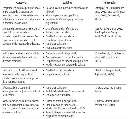 Las variables presentadas en la Tabla 3 son el resultado de un análisis detallado de la literatura analizada sobre el uso de la DS en temas de seguridad y crimen. Las variables seleccionadas sirven como punto de partida para la construcción de futuros modelos conceptuales para la investigación criminal, ofreciendo una base sólida que permite abordar fenómenos complejos de manera integral.