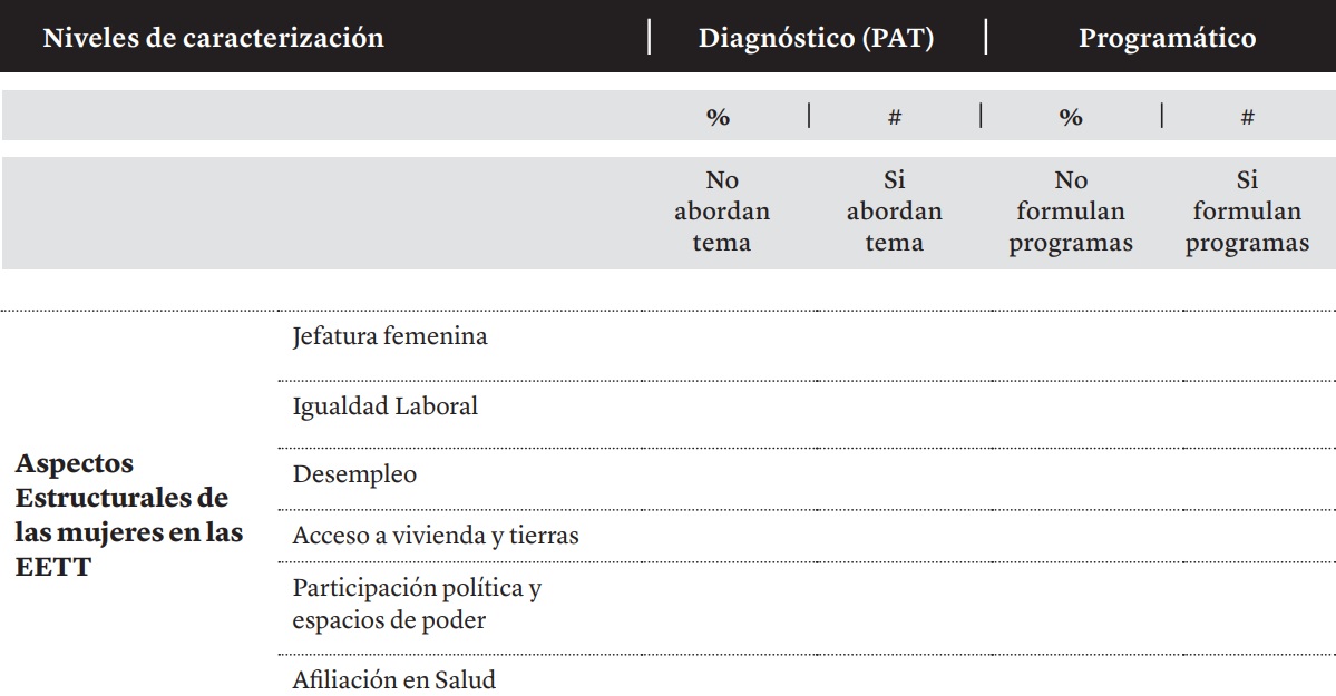 Este trabajo propone una tabla (Anexo 1) que permitirá a los tomadores de decisión conocer el nivel en que los planes, en su diagnóstico, atendieron las seis variables contempladas previamente para dar cuenta de la situación situacional de las mujeres en los territorios; y saber además si se formularon programas tendientes a mejorar el nivel de goce efectivo de los derechos de las mujeres, a partir de proyectos de educación, salud, acceso a vivienda y tierras, acceso al trabajo, entre otros. También permitirá aproximarse a los diferentes daños que pueden sufrir las mujeres en el marco del conflicto armado. En este ejercicio es importante mencionar que los daños que se enlistan en la tabla son meramente enunciativos, por lo cual es posible que en los procesos de caracterización aparezcan otro tipo de daños.