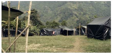 En la vereda, a mano derecha, el primer campamento era de la ONU. Una enorme carpa blanca, muy bien equipada, con visible sistema de aire acondicionado y caminos artificiales alrededor, demarcados con pequeña piedra blanca -con certeza traída desde Cali- que semejaba un conjunto residencial urbano. A menos de 100 metros, un campamento militar se organizaba con sus reconocidas carpas con pintas verdes, también adecuadamente dotado. Pasados otros 100 metros, iniciaba a ambos lados del camino una barrera que, con plástico negro, impedía la visibilidad hacia lo que parecía ser el campamento de los exguerrilleros. Pronto nos explicarían que a un lado se congregaba el Frente Galvis y al otro el Frente Sexto, ambos pertenecientes al Bloque Occidental de las FARC-EP.