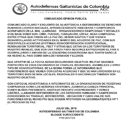 Porque pues ahora en este momento para nadie es un secreto que, mientras siga la situación así en Colombia, la desigualdad social que hay aquí en el país, mientras que siga el hambre y siga la miseria, pues siempre van a haber personas que se van a querer organizar nuevamente tras las armas. Y es que acá en el territorio ya hay otra gente armada. Acá aparecen grafitis del ELN, el EPL (...). No más el año pasado (2016) en octubre, no llevaban sino quince días allí (los guerrilleros de las FARC-EP) cuando ya aparecen los grafitis de las AUC (Líder campesino, comunicación personal, 10.2017).