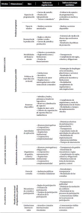 La Tabla 1, actualizada a las problemáticas renovadas del amplio sector de las comunicaciones, recupera los niveles del indicador de participación ciudadana reconocidos en la citada reunión de la Unesco, en 1977. Estos niveles se desagregan en dimensiones y ejes, desde los cuales se desprenden índices, los cuales se presentan en dos columnas, y una de ellas indica las regulaciones e intervenciones estatales concretas, de las que se puede analizar su existencia y sus características. El espacio reconocido como mapa mediático refiere a los datos que deben ser construidos en la investigación, a fin de relevar la situación efectiva del escenario mediático.