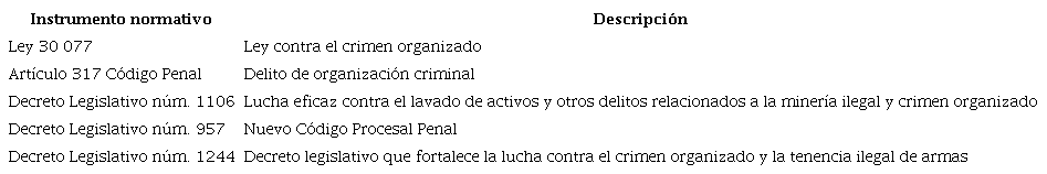 La lucha contra el crimen organizado en el Perú se caracteriza por contar con una gran cantidad de instrumentos normativos de naturaleza penal y procesal penal. Como se observa en el Cuadro 1, existe una amplia normativa dirigida a identificar aquellos delitos pasibles de ser calificados como crimen organizado y a establecer las pautas para su persecución, juzgamiento y sanción. También se distingue una normativa que se encarga de fortalecer los mecanismos penales para delitos concretos como el lavado de activos y la minería ilegal. Finalmente, se identifican normas orientadas a tipificar el delito de organización criminal, previsto en el Artículo 317 del Código Penal.