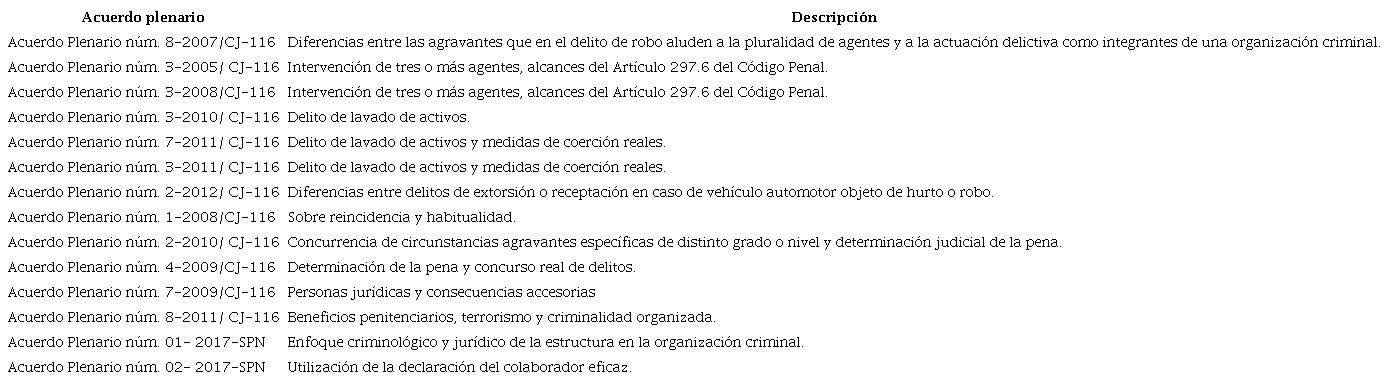 Por otro lado, y debido a la ambigüedad de la técnica legislativa de algunas de las normas penales mencionadas o a la complejidad de su aplicación, la Corte Suprema de Justicia de la República, así como la Sala Penal Nacional, han aprobado una serie de acuerdos plenarios vinculantes sobre crimen organizado (ver Cuadro 2). Estos instrumentos tienen como objetivo poner fin a la disparidad de criterios interpretativos a nivel jurisprudencial. En ese sentido, se identifican acuerdos plenarios orientados a definir los elementos criminológicos indispensables para la configuración de la organización criminal (AP 01-2017-SPN), así como para la de delitos concretos vinculados al crimen organizado, tales como el lavado de activos (AP 03-2010/CJ-116) o el tráfico ilícito de drogas (03-2008/CJ-116). Asimismo, se encuentran diversos acuerdos vinculantes que desarrollan los criterios para la aplicación de las normas procesales para casos de crimen organizado o de técnicas especiales de investigación, como la figura de colaboración eficaz (AP 02-1017-SPN).