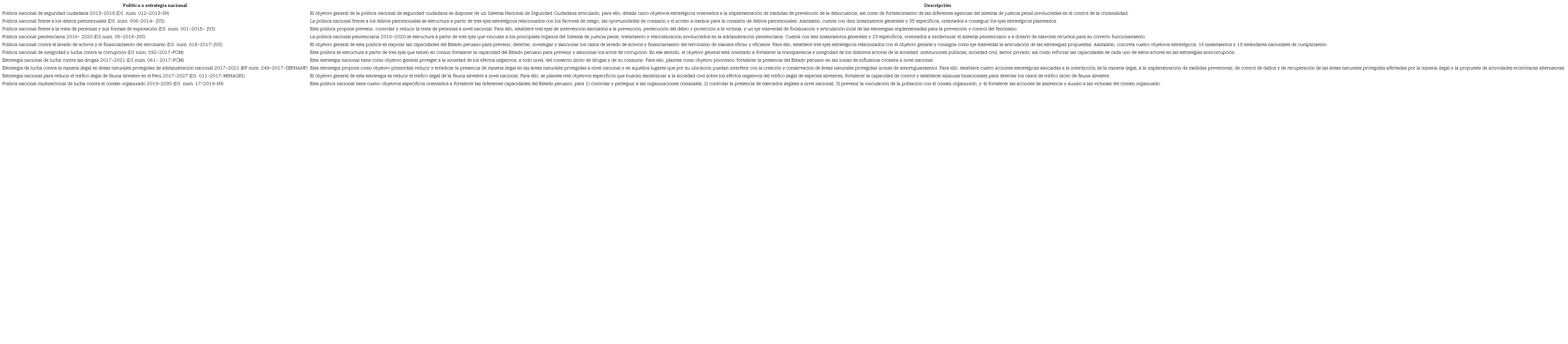 Finalmente, y de manera más reciente, el Estado peruano ha considerado necesario complementar la normativa penal y procesal penal contra el crimen organizado con instrumentos de política dirigidos a combatir de manera más eficaz la presencia del crimen organizado en el Perú. Como se aprecia en el Cuadro 3, desde el año 2013 se ha incrementado el número de políticas y estrategias nacionales encaminadas a fortalecer el control de las diferentes manifestaciones del crimen organizado a nivel de delitos específicos.