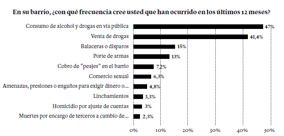 En la zona sur de la ciudad de Santiago existen al menos 700 000 personas que viven en vecindarios expuestos a criminalidad organizada, a violencias cotidianas y bajo agudas condiciones de precariedad material y urbana (Atisba, 2017). De hecho, información que hemos estudiado en la investigación (Figura 1) evidencia que el tráfico de drogas, el consumo de alcohol y drogas en las calles, y las balaceras son hechos frecuentes en la vida cotidiana de quienes residen en estos territorios.
