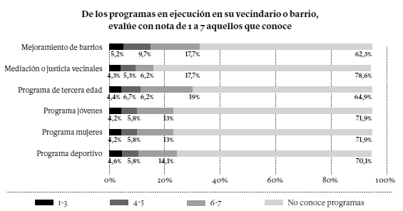 Asociado a lo anterior, cuando se consulta sobre la evaluación (escala de 1 a 7, siendo 1 el peor y 7 el máximo puntaje) que ellos realizan para los casos que conocen, se observa que los programas mejor evaluados son los de mejoramiento de barrios y los programas de tercera edad. Este resultado puede estar directamente vinculado al nivel de conocimiento declarado anteriormente.